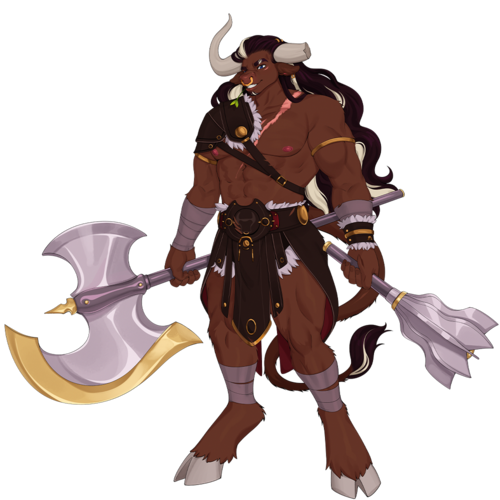 Brint stands at a towering eight feet and six inches, his muscular dark brown hide bristling with occasional tufts of fur. He has two light blue eyes regarding you with ever-present interest – people don't expect a musclebound minotaur to be particularly intelligent, but you know those eyes hide a curious, if somewhat sheltered, mind. Two thick white horns sprout out and up from his head above his ears, an ever-present threat to hanging lights, low doorways, or particularly dumb foes. His snout is a light pink, housing the very long bestial tongue of a bull.